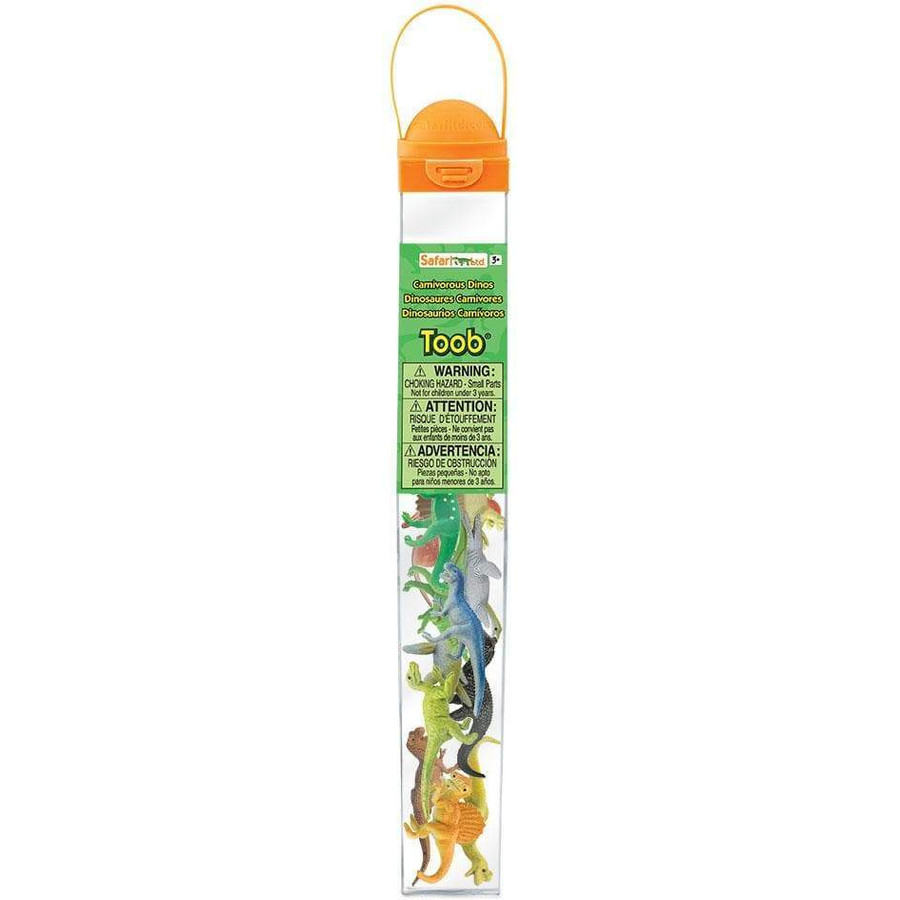 Size: 3.8 cm long, 3.8 cm wide, and 32.5 cm tall, this Toob is a bit larger than the size of a standard American ruler and contains figurines of 12 different carnivorous dinosaurs that range from 3.2 cm to 9.5 cm tall.