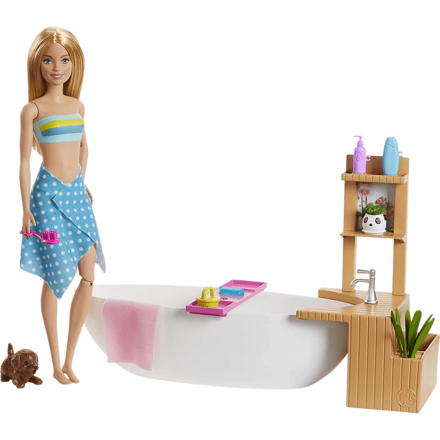 Η Barbie έχει όσα χρειάζεται: δίσκο, προϊόντα μπάνιου, σφουγγάρι, βούρτσα και πετσέτα. Το μπάνιο έχει επίσης έπιπλο με χρώμα ξύλου και ένα κασπό-πάντα. Υπάρχει χώρος να κάτσει και το σκυλάκι της και σημεία για να αποθηκεύσει τα αξεσουάρ.