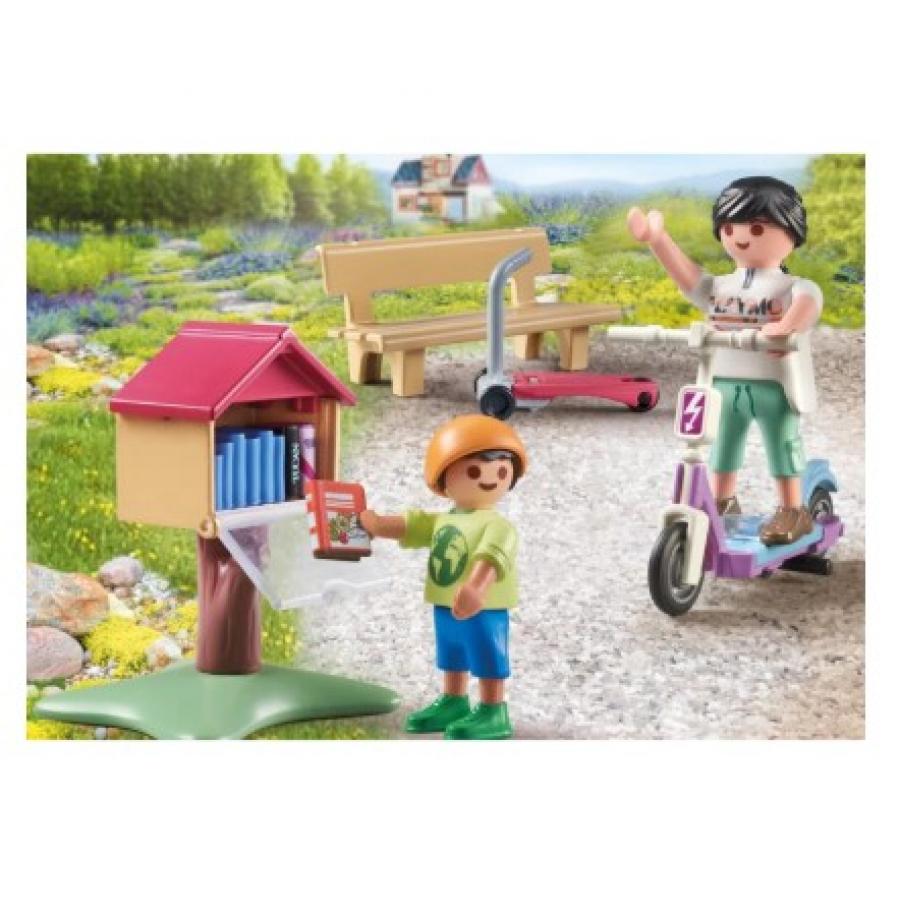 Μαμά και γιος κάνουν μία μικρή στάση στο αγαπημένο τους παγκάκι για να χαζέψουν την ομορφιά της φύσης και να διαβάσουν ενδιαφέροντα βιβλία από την υπαίθρια ανταλλακτική βιβλιοθήκη. Στο ντουλάπι της ανταλλακτικής βιβλιοθήκης, υπάρχουν πάντα νέες ιστορίες για να ανακαλύψει κανείς. Μαμά και γιος κάνουν μια μικρή βόλτα με τα scooters και σταματούν για να διαλέξουν το επόμενο βιβλίο τους. Το μικρό αγόρι θα επιστρέψει το βιβλίο που δανείστηκε. Ειδικά χαρακτηριστικά παιχνιδιού: Περιλαμβάνει δύο φιγούρες PLAYMOBIL Βιβλιοθήκη με βάση Ποικιλία βιβλίων Ένα παγκάκι Και πολλά άλλα φανταστικά αξεσουάρ.
