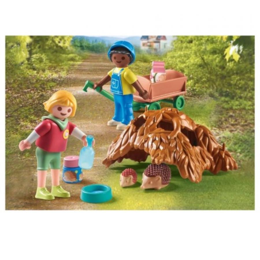 Περιλαμβάνει δύο φιγούρες PLAYMOBIL, δύο σκατζόχοιρους, ένα χειροκίνητο καρότσι, το καταφύγιο από φύλλα και πολλά άλλα φανταστικά αξεσουάρ για τη φροντίδα των σκατζόχοιρων.