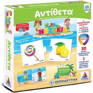 Κλειστό ή ανοιχτό, µεγάλο ή µικρό; Βρες τις αντίθετες έννοιες, ένωσε τα κοµµάτια puzzle µεταξύ τους και µάθε τα αντίθετα στα ελληνικά και στα αγγλικά! Περιέχει και εκπαιδευτική χειροτεχνία, µε την οποία τα παιδιά ζωγραφίζοντας και δηµιουργώντας θα εµπεδώσουν τις αντίθετες έννοιες του παιχνιδιού! ΤΑ ΝΗΣΑΚΙΑ ΤΗΣ ΓΝΩΣΗΣ™ είναι µια µοναδική εκπαιδευτική σειρά παιχνιδιών προσχολικής ηλικίας, µε την οποία η κατάκτηση της γνώσης γίνεται πιο διασκεδαστική από ποτέ! Οι θεµατικές ενότητες, οι στόχοι και οι δράσεις έχουν σχεδιαστεί σε συνεργασία µε Έλληνες παιδαγωγούς, σύµφωνα µε το αναλυτικό Πρόγραµµα Σπουδών του Υπουργείου Παιδείας. Περιλαμβάνει: 30 µεγάλα κοµµάτια puzzle διπλής όψης µε αντίθετες έννοιες, στα ελληνικά και αγγλικά. Εκπαιδευτική χειροτεχνία ζωγραφικής 40εκ. Χ 40εκ. Παιδαγωγικός Οδηγός.