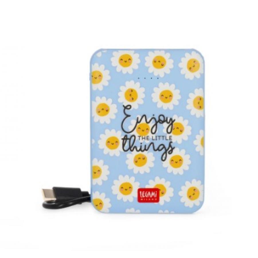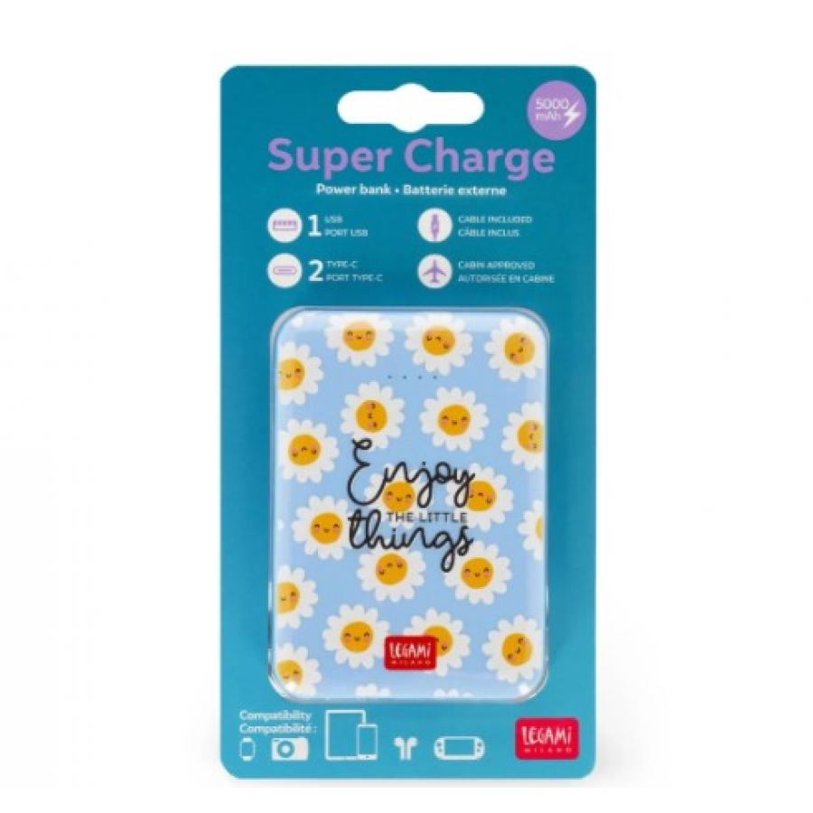 Το φορητό φορτιστή Legami Supercharge - Daisy είναι ένα απαραίτητο αξεσουάρ ταξιδιού, εγκεκριμένο για καμπίνα και αρκετά ισχυρό για να φορτίζει έως και δύο συσκευές ταυτόχρονα. Διαθέτοντας μια εύχρηστη ενδεικτική λυχνία LED μπαταρίας, μία θύρα USB και δύο θύρες Type-C, αυτό το απαραίτητο τεχνολογικό εξάρτημα είναι συμβατό με smartphone, tablet και ψηφιακές φωτογραφικές μηχανές. Το Supercharge μπορεί να φορτίσει έως και δύο συσκευές ταυτόχρονα.