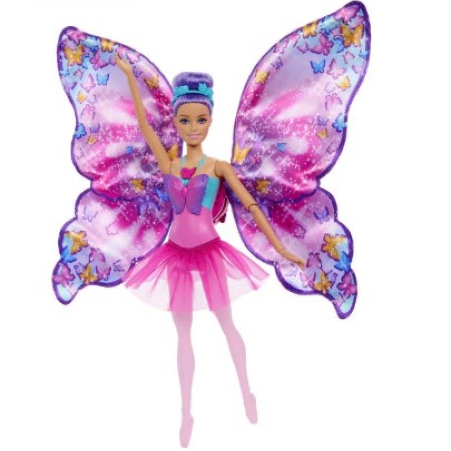 Kids will love playing with Barbie Butterfly Ballerina doll who transforms from dancer to butterfly with the push of a button on the doll's bust - the purple skirt opens to reveal giant butterfly wings and a pink tulle skirt, so pretty! To close the wings, simply press down into place - then press the button to turn them back on and play out the magical moment over and over again! Barbie doll wears her purple hair in a bun with a floral ribbon and has a butterfly-inspired bodice and classic ballet slippers for ballerina role-play! With twice the play possibilities, Butterfly Ballerina doll makes an enchanting playset for kids ages 3 and up!