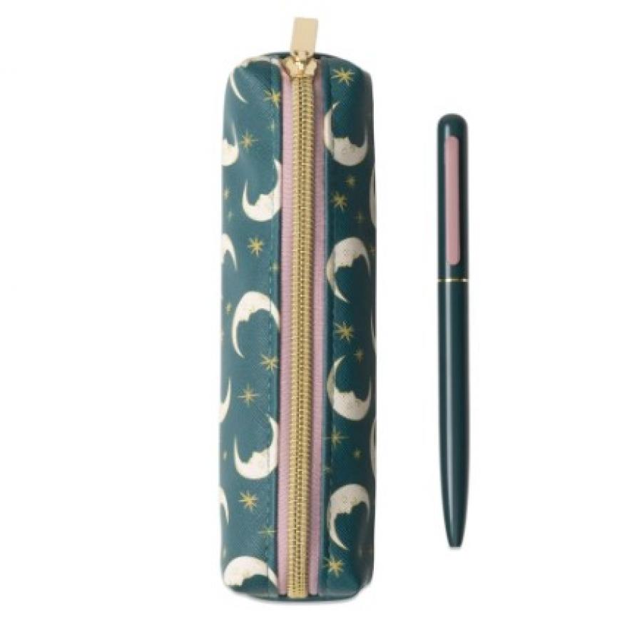 Bring a cosmic touch to your daily essentials with the Teal Moon Pen & Pouch Set. The moon-themed vegan leather pouch paired with a matching pen blends function with celestial charm.