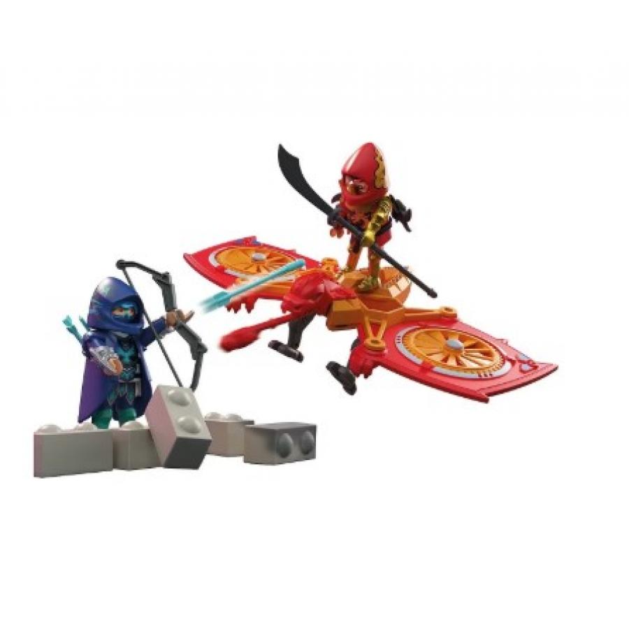 PLAYMOBIL Heroes: Red Dragon vs. Shadow Raven – Ninja Drone Battle An epic battle erupts between rival ninjas! Red Dragon attacks with his agile dragon drone, featuring rotating wings for dynamic missions. The integrated cannon, activated by a trigger to fire projectiles, adds extra excitement. While Shadow Raven defends himself with a bow, arrows, and a shuriken behind a destructible wall, Red Dragon relies on his powerful Chinese longsword to fight for his clan in close combat. This set delivers thrilling ninja action!