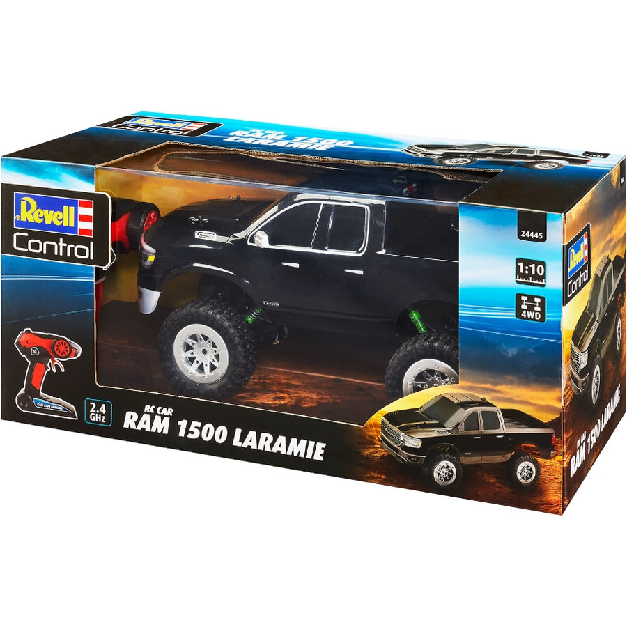 Immerse yourself in the captivating world of off-road driving with the Revell Control RC Car 2020 RAM 1500 Laramie "Back in Black". This 1:10 scale model stands out not only for its impressive size of 420mm long, 210mm high and 170mm wide, but also for its authentic, highly detailed design. For children aged 8 and over and of course for all adult RC enthusiasts, this RC car is an absolute highlight and brings the American way of life directly to your home.