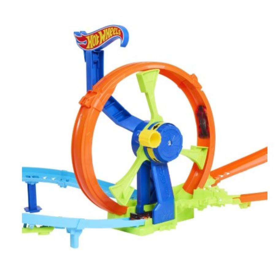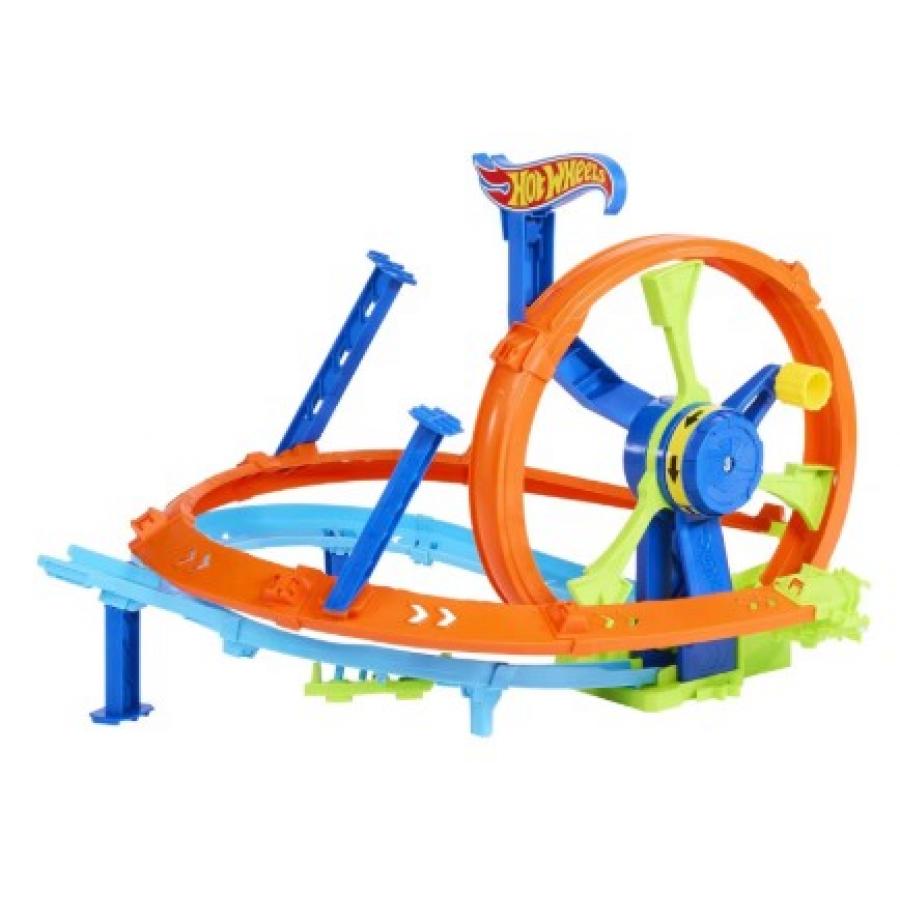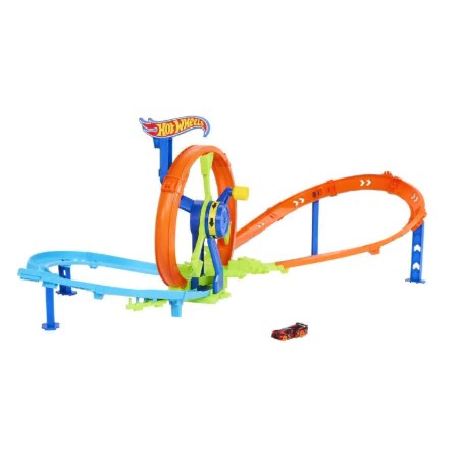 The new Hot Wheels® Rapid Launch & Loop™ Track is here. Activate the innovative wheel mechanism and unleash the Hot Wheels cars to repeatedly perform stunts, race and crash in this wild playset. Play the included 1:64 scale toy car on the track and the kicker automatically boosts it through the loop, around a curve, through a crash zone and then back to the start to repeat. Amp up the excitement by adding more cars for the inevitable crash. Additional cars sold separately. Set folds up and features a handle for easy transport and storage. Colors and decorations may vary.