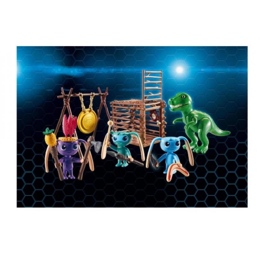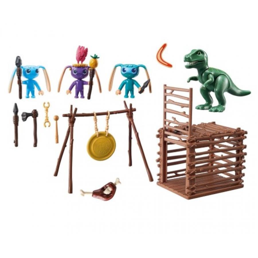 The included T-Rex can be caught in the trap by sliding the lock. - Two Alien Warriors are included, with their leader incl. crown and pineapple sceptre. - The gong can be hung anywhere on the frame and swings back and forth freely.