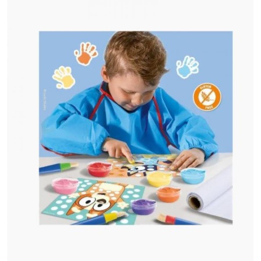 The set includes drawing cards with Bluey and Bingo, bright fingerpaints, brushes and a painting apron, so children can experiment with shapes, textures and colors safely. The activity helps develop imagination, fine motor skills and hand-eye coordination, while the paints are safe, gluten-free and easily washed off the skin and clothes.
