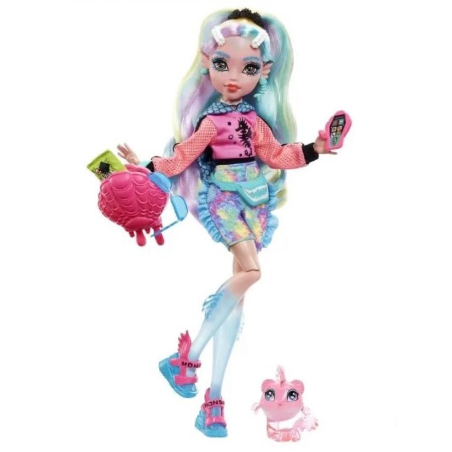 School is back in session and the Monster High students are showing off their unique style! Laguna walks the halls of Monster High looking fabulous in a pink tank top with mesh sleeves and colorful cycling shorts. Her ensemble is completed with a fanny pack, a shell-shaped backpack, and colorful flip-flop sandals inspired by her origins. Change up her look with a fish scale-inspired swimsuit and striking accessories! Don't forget her sweet little piranha, Neptune! School is back in session and the Monster High students are walking the halls in incredible style! Laguna wears a pink tank top with mesh sleeves and trendy tie-dye cycling shorts. Her accessories, with incredible details, include a fanny pack, sunglasses and flip-flop sandals! Change her look with a fish scale swimsuit and unique accessories, such as a shell-shaped backpack, snacks and a mobile phone. She always has her sweet little piranha, Neptune, with her!