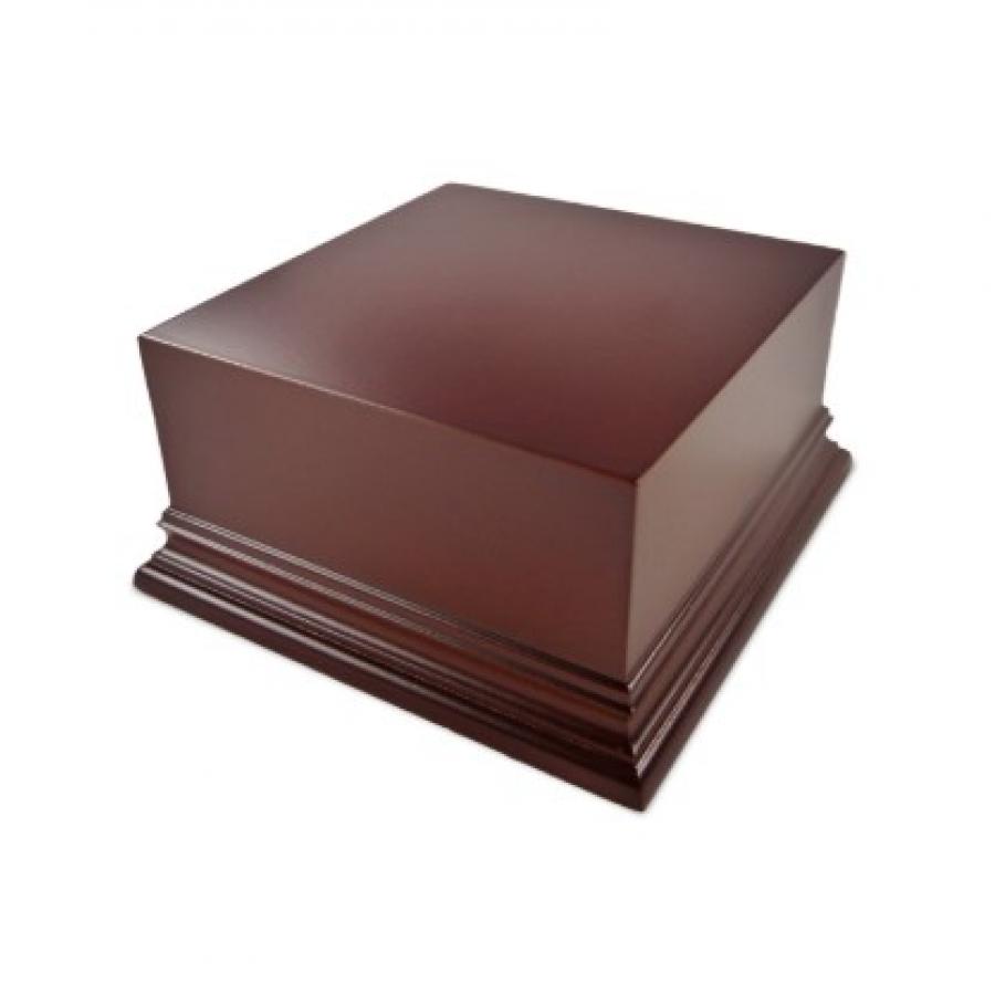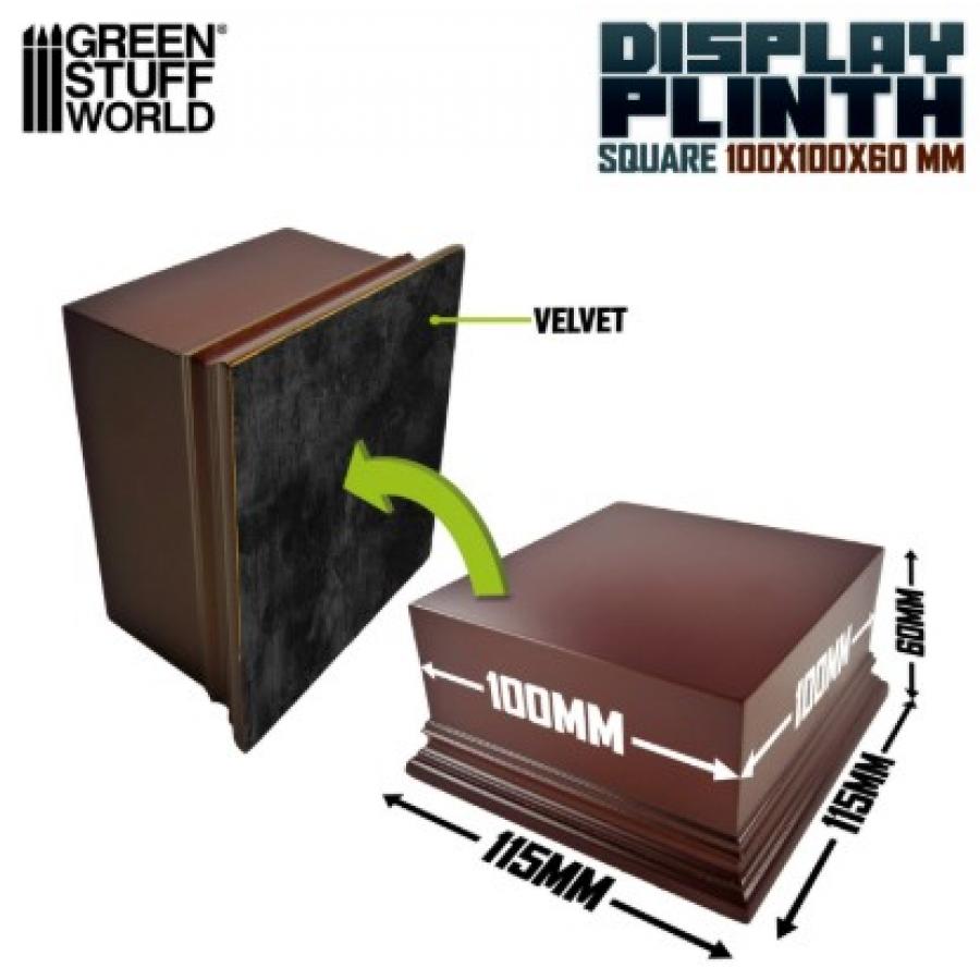 Τετράγωνη βάση από ξύλο MDF σε χρώμα φουντουκιού καφέ με λακαρισμένο φινίρισμα, ιδανική για την έκθεση των ειδωλίων σας. Η βάση διαθέτει απαλό πράσινο τσόχα στο κάτω μέρος.