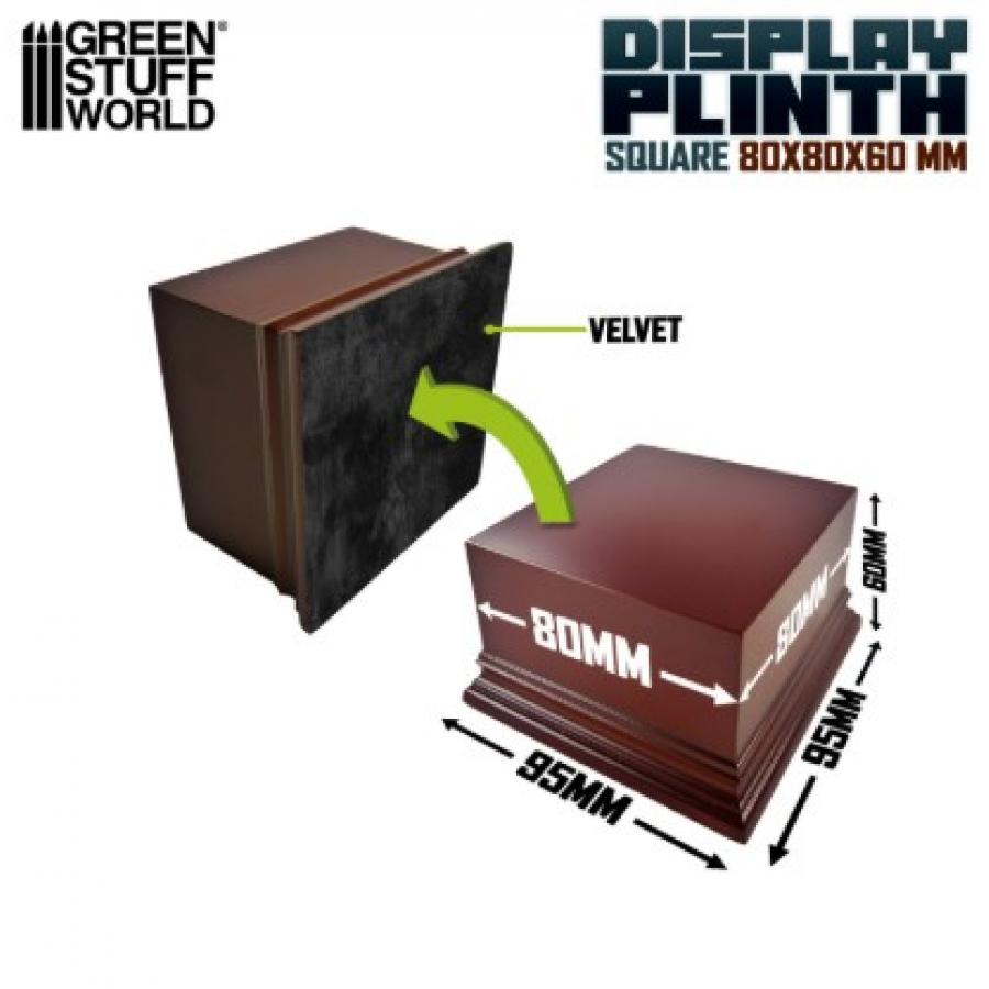 Τετράγωνη βάση από ξύλο MDF σε χρώμα φουντουκιού καφέ με λακαρισμένο φινίρισμα, ιδανική για την έκθεση των ειδωλίων σας. Η βάση διαθέτει απαλό πράσινο τσόχα στο κάτω μέρος.