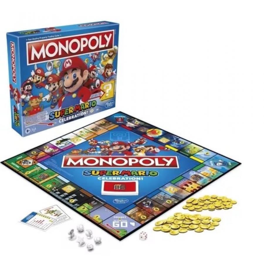 Monopoly Super Mario Celebration.Η έκδοση Super Mario Celebration του παιχνιδιού Monopoly προσφέρει πολλή διασκέδαση για τους λάτρεις του Super Mario! Επιλέξτε από 6 μάρκες, αγοράστε, πουλήστε και ανταλλάξτε τοποθεσίες από τα εμβληματικά παιχνίδια Super Mario. Περιλαμβάνει αγαπημένους χαρακτήρες και θέματα από όλα αυτά τα χρόνια, μέχρι το 1985 και το πρώτο βιντεοπαιχνίδι Super Mario Bros. Το παιχνίδι Monopoly διαθέτει ένα Question Block με ηχητικά εφέ που μπορούν να αλλάξουν εντελώς την τύχη ενός παίκτη. Τα σπίτια και τα κάστρα της πριγκίπισσας Peach αντικαθιστούν τα κλασικά σπίτια και ξενοδοχεία. Αυτή η έκδοση του κλαισκού επιτραπεζίου είναι ένα υπέροχο δώρο γενεθλίων ή γιορτών για τους θαυμαστές του Super Mario.