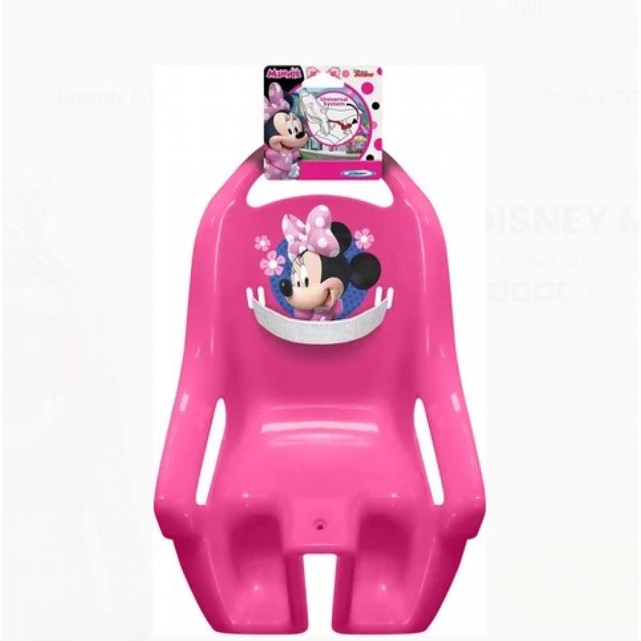 Το κάθισμα ποδηλάτου Minnie Mouse για κούκλες σας επιτρέπει να παίρνετε την κούκλα βόλτα με το ποδήλατο. Το κάθισμα τοποθετείται κάτω από τη σέλα του ποδηλάτου με μια βάση γενικής χρήσης που ταιριάζει στα περισσότερα ποδήλατα. Η βάση απαιτεί 2 cm χώρο κάτω από τη σέλα για σωστή τοποθέτηση.