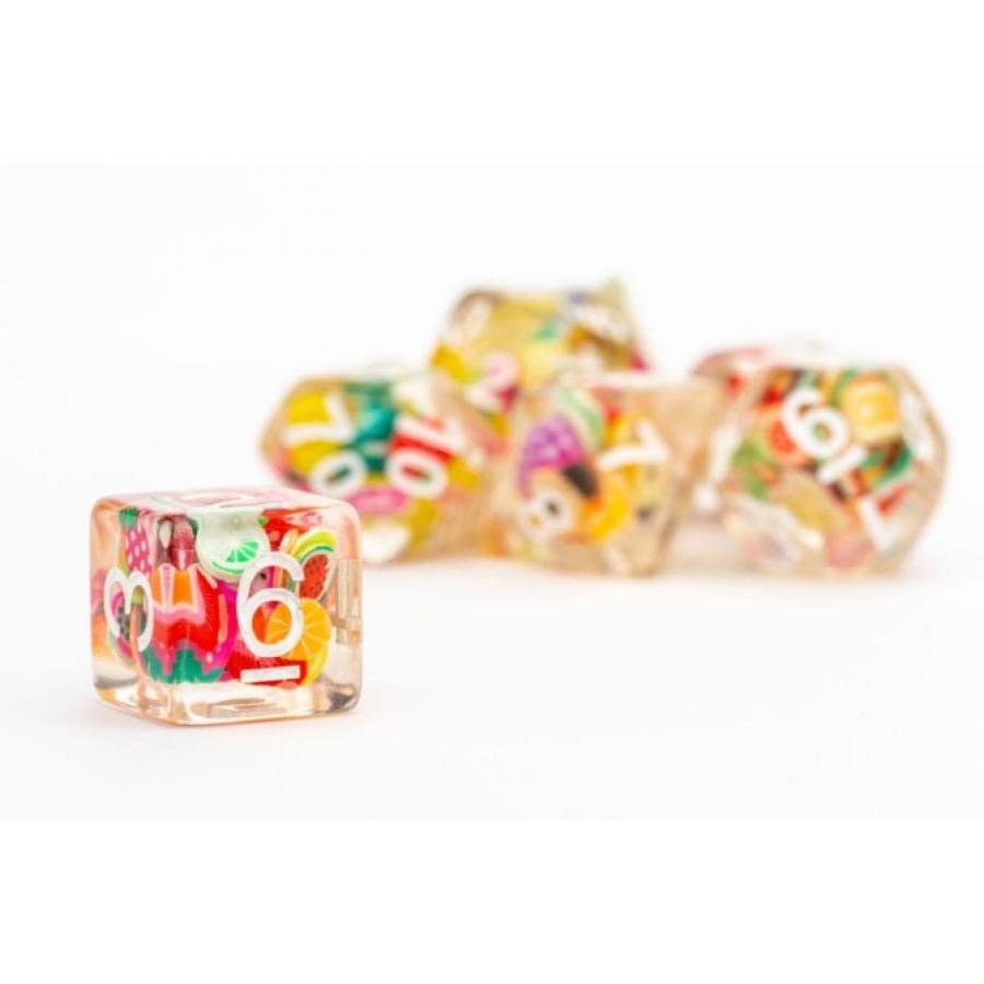 Τα ζάρια ρητίνης FanRoll έχουν μοναδικά στοιχεία που προσθέτουν λάμψη σε κάθε τραπέζι παιχνιδιού. Αυτά είναι σετ πολυεδρικών ζαριών 16 χιλιοστών πλήρους μεγέθους που διαθέτουν 7 ζάρια (d4, d6, d8, d10, d10%(00-90), d12 και d20).