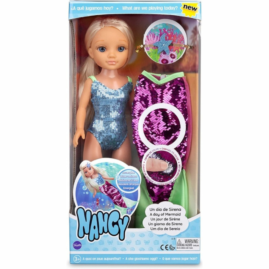 Nancy σε προσκαλεί στον μαγευτικό της κόσμο για να ζήσεις και εσύ μια μέρα σαν γοργόνα! Ζήσε μαζί της μια συναρπαστική περιπέτεια στο βυθό. Μεταμόρφωσε τη Nancy σε πανέμορφη λαμπερή γοργόνα! Φόρεσε ουρά γοργόνας στην κούκλα, βάλε τη στο νερό ή άλλαξε χρώμα στην ουρά της με τις παγιέτες.