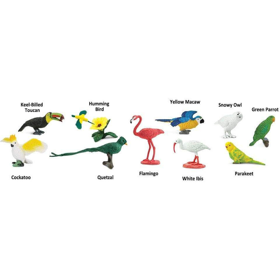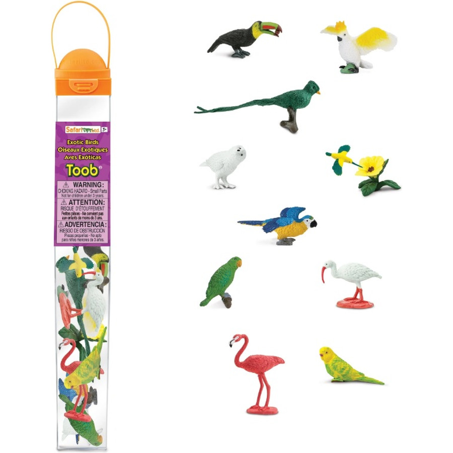 Αυτό το Toob σας φέρνει μερικούς από τους πιο εκπληκτικούς εξωτικούς φτερωτούς φίλους από όλο τον κόσμο. Περιλαμβάνει ένα Parakeet, Quetzal, Yellow Macaw, Humming Bird, Hibiscus Flower, Keel-Billed Toucan, Cockatoo, Flamingo, White Ibis, Snowy Owl και Greet Parrot.