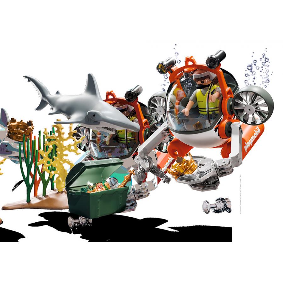 Ζήσε μια μαγευτική αποστολή με το PLAYMOBIL Υποβρύχιο Κυνήγι Θησαυρού! Το υποβρύχιο διαθέτει κινούμενους βραχίονες για εξερεύνηση και συλλογή ευρημάτων, καθώς και αποσπώμενο θόλο για ρεαλιστικό παιχνίδι. Οι λειτουργίες πλευστότητας επιτρέπουν στο σκάφος να επιπλέει ή να βυθίζεται όπως ένα πραγματικό υποβρύχιο.