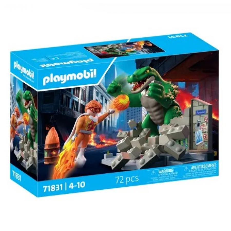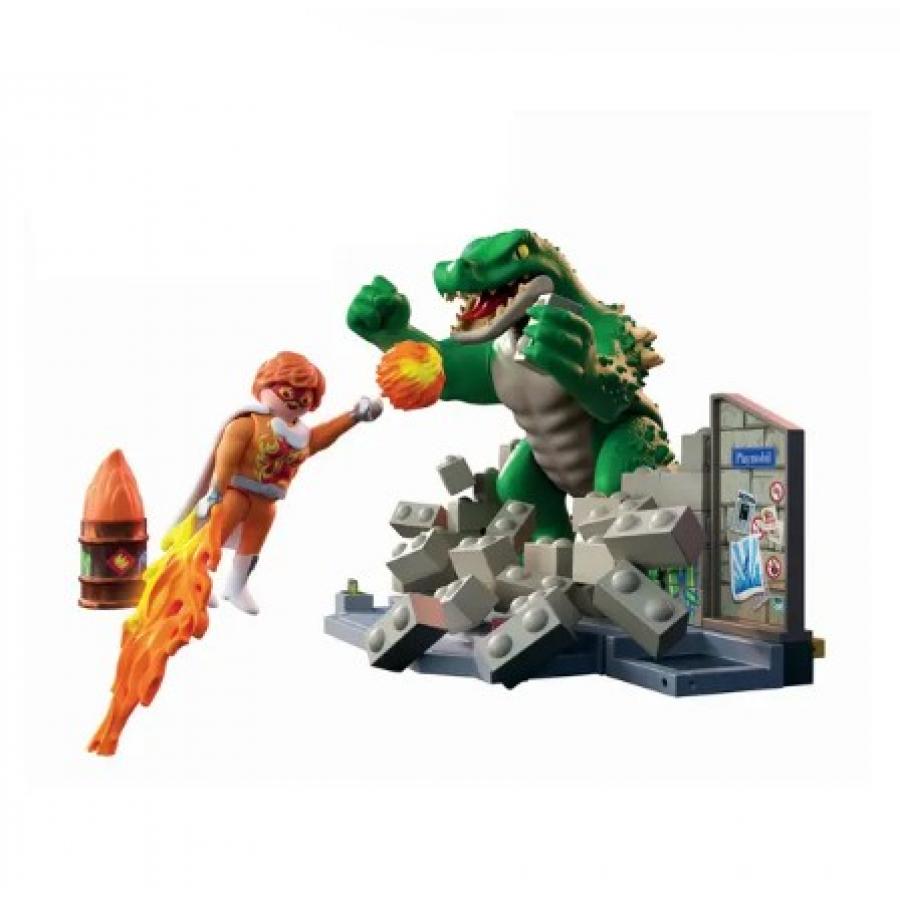 Στο Playmobil Heroes MegaRaptor: Υπερήρωες εναντίον της Γιγάντιας Σαύρας, αυτή η γιγάντια σαύρα μόλις κατέστρεψε τα τείχη της Playmopolis! Με ένα καταστροφικό χέρι, ένα ισχυρό νύχι και τρομακτικά σαγόνια, σπέρνει τον όλεθρο όπου κι αν πάει. Τι μπορεί να γίνει για να την σταματήσει; Ένας γενναίος υπερήρωας ξεκινά την καταδίωξη! Εξοπλισμένος με αφαιρούμενα πυροβόλα βλήματα, μια κάπα και ακλόνητη αποφασιστικότητα, δίνει τον καλύτερό του εαυτό για να υπερασπιστεί την πόλη. Το εναλλάξιμο πρόσωπό του επιτρέπει μια ποικιλία εκφράσεων για ακόμα πιο δραματική ένταση. Με το φθαρτό τείχος του που καταρρέει (και ξαναχτίζεται ασταμάτητα), καθώς και τα πολλά αξεσουάρ του - φλόγες, βλάστηση, ένα κρυφό βαρέλι - οι αντιπαραθέσεις είναι... επικές. Και το έργο είναι συναρπαστικό.
