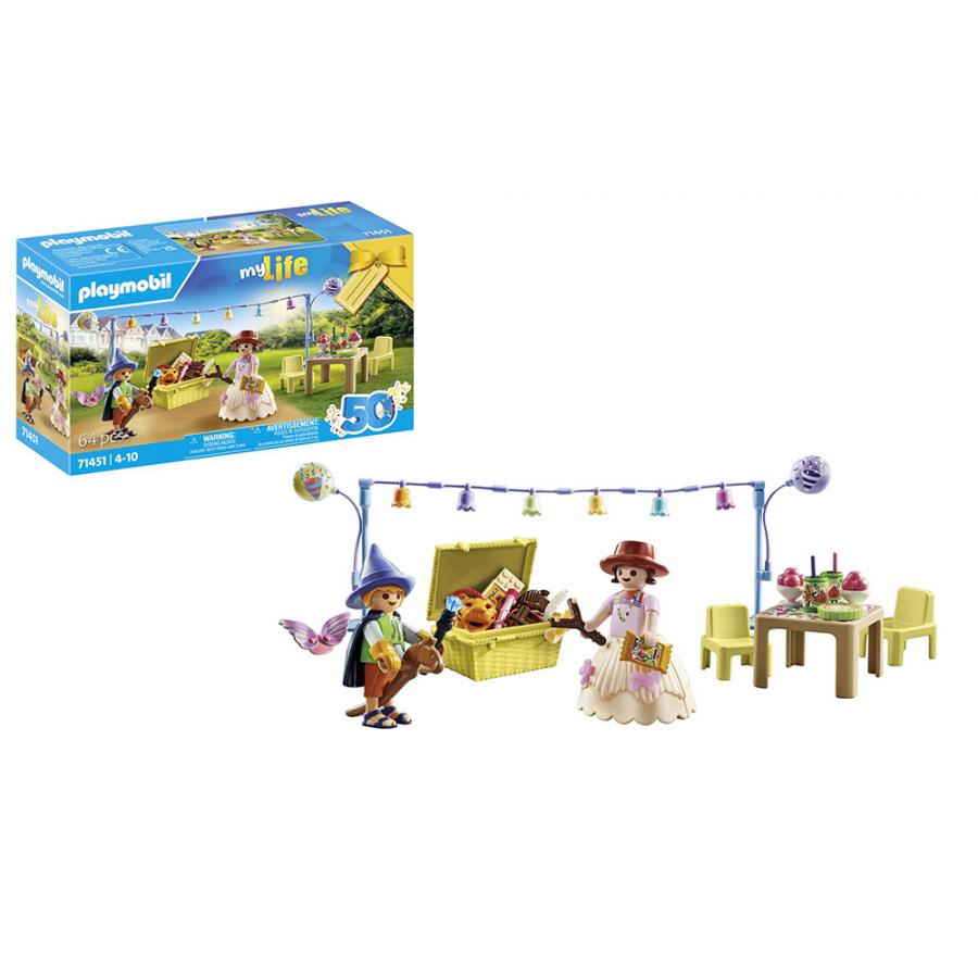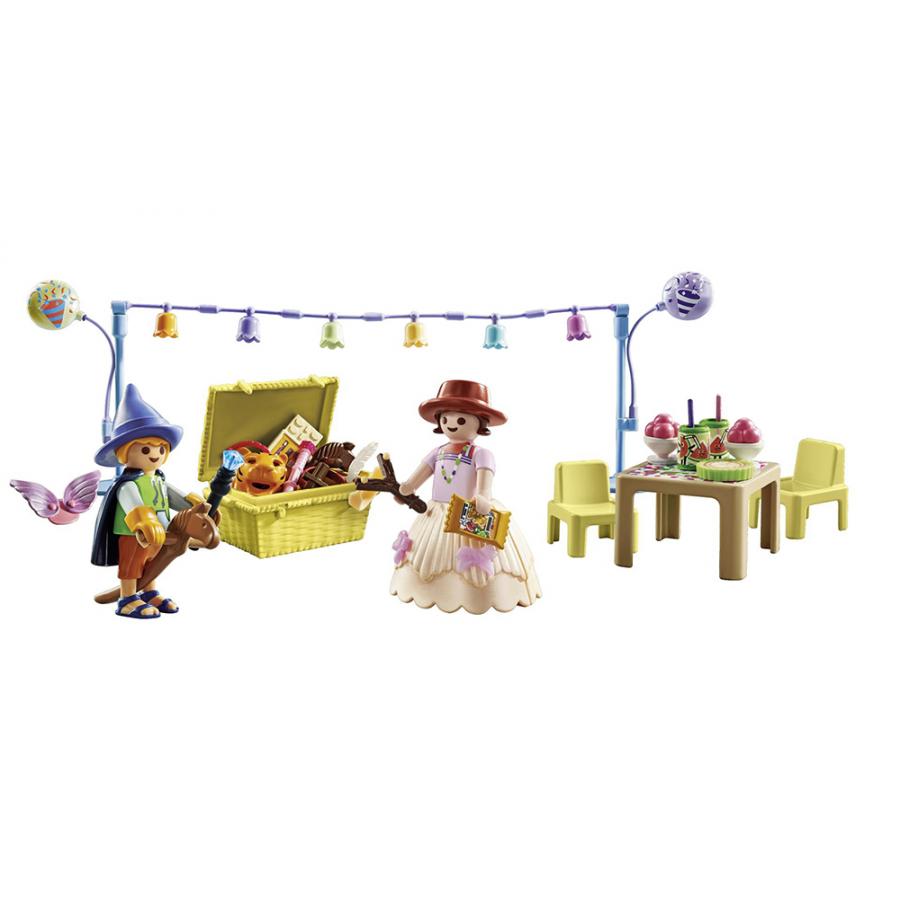 Ετοιμαστείτε για το πιο τρελό πάρτι μεταμφιέσεων όλων των εποχών με το ολοκαίνουργιο σετ παιχνιδιού PLAYMOBIL. Ο εορτάζοντας έχει ετοιμάσει το απόλυτο πάρτι μασκέ και περιμένει τους φίλους του για να γιορτάσουν όλοι μαζί. Καθένας θα ντυθεί και κάτι διαφορετικό: άλλος μάγος, άλλος πριγκίπισσα, άλλος καουμπόης... οι στολές είναι πολλές και οι επιλογές ατελείωτες. Και όταν κουραστούν και πεινάσουν, οι μικροί καλεσμένοι μπορούν να καθίσουν στο παιδικό τραπέζι και να απολαύσουν πεντανόστιμα γλυκίσματα και χυμούς. Με ειδικό ταμπελάκι για ευχές πάνω στο κουτί.
